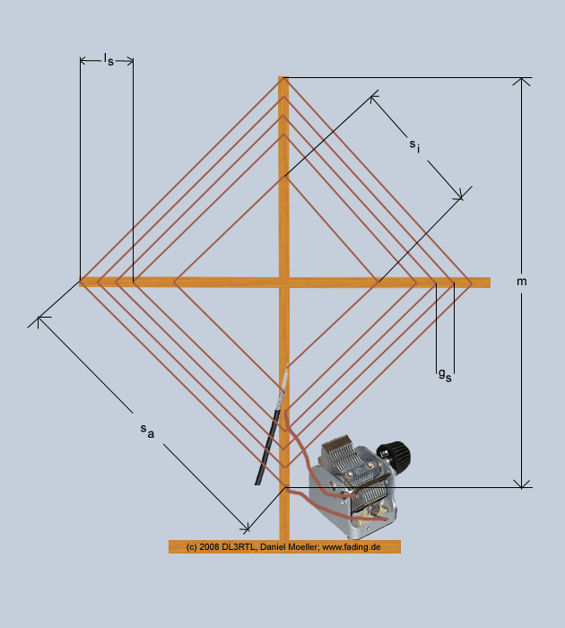Zunächst fertigen Sie aus den Holzleisten ein Kreuz. Zur Fixierung habe ich in der Mitte vier der Eisenwinkel verwendet, vgl. Fotos. Nun säge man vom äußeren Ende jeder Latte im Abstand von einem Zentimeter 12 kleine Schlitze in das Holz. Am besten leicht schräg zum Mittelpunkt, da der Draht später in diesen Schlitzen gespannt wird und ansonsten wieder herausrutschen könnte. Das Holzkreuz auf den Boden legen und den Draht vom äußeren Ende her Richtung Mittelpunkt in 11 Windungen zu einer großen Spule wickeln. Die Enden des Drahtes mit den beiden Anschlüssen des Drehkondensators verbinden -> die Drähte auf direktem Wege und mit mind. 10 mm Abstand zur Spule kurz zum Kondensator führen.